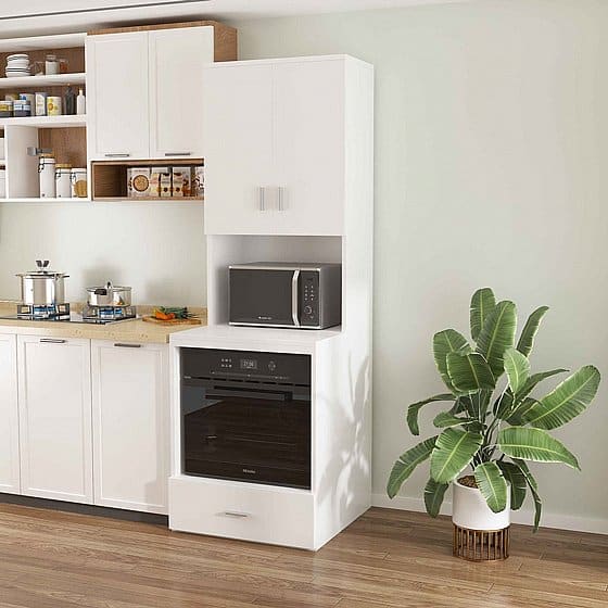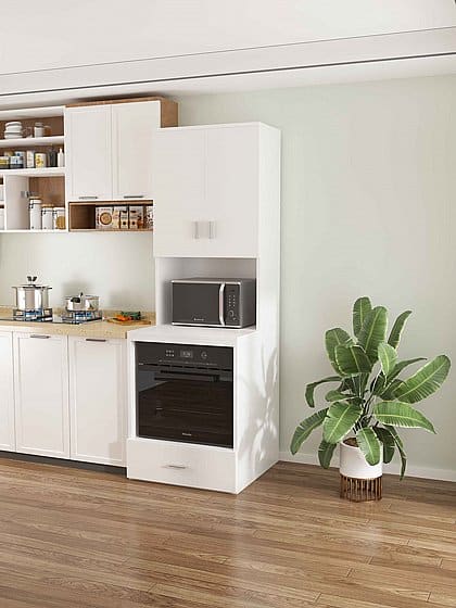 ארון בילד אין לתנור ולמיקרוגל בצבע לבן, דגם קאבו CABO מבית סטאר שופ STAR SHOP. ארונית מעוצבת, יציבה וחזקה, הכוללת מגירת קלפה, מדף עליון ושתי דלתות עם מדף פנימי – פתרון אחסון אידיאלי לכל מטבח.